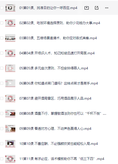 【饭局社交全攻略:21节课快速精通中国式饭局潜规则】 some 收录于 视频资源 2024-04-28 约 222 字 预计阅读 1 分钟 目录 介绍 资源 介绍 饭局社交全攻略:21节课快速精通中国式饭局潜规则,助你搞定社交人脉,轻松赢人心,阿里云盘和夸克网盘资源下载。 这套人人必学的饭局社交课,包含四大模块、21节精品课程,全流程教授饭局方法技巧。 在这套课程里,姜老师会从饭前准备、开局点单、临场应酬、饭后安排,一站式指导你在饭桌上,什么时候该做什么,该说什么。 还会传授你独家总结出屡试不爽的各类话术,以及绝对少不了万众期待的喝酒攻略! 让你喝酒潇洒,敬酒有礼,拒酒体面,形象满分! 资源 夸克网盘 阿里云盘
