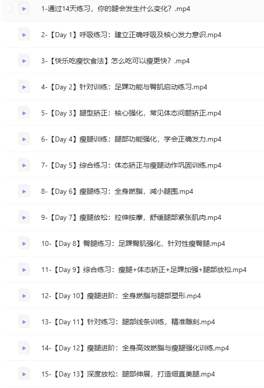 【韩小四:14天瘦腿直腿计划】 some 收录于 视频资源 2024-04-22 约 144 字 预计阅读 1 分钟 目录 介绍 资源 介绍 韩小四:14天瘦腿直腿计划,夸克网盘资源,阿里云盘资源,免费下载。 由韩小四设计的瘦腿直腿计划为期14天,专注于塑造纤细笔直的双腿。课程涵盖腿部运动、拉伸训练和饮食建议,帮助学员减脂塑形,提升腿部线条美感。通过系统训练和专业指导,学员将在短时间内实现理想的瘦腿效果。 资源 夸克网盘 阿里云盘