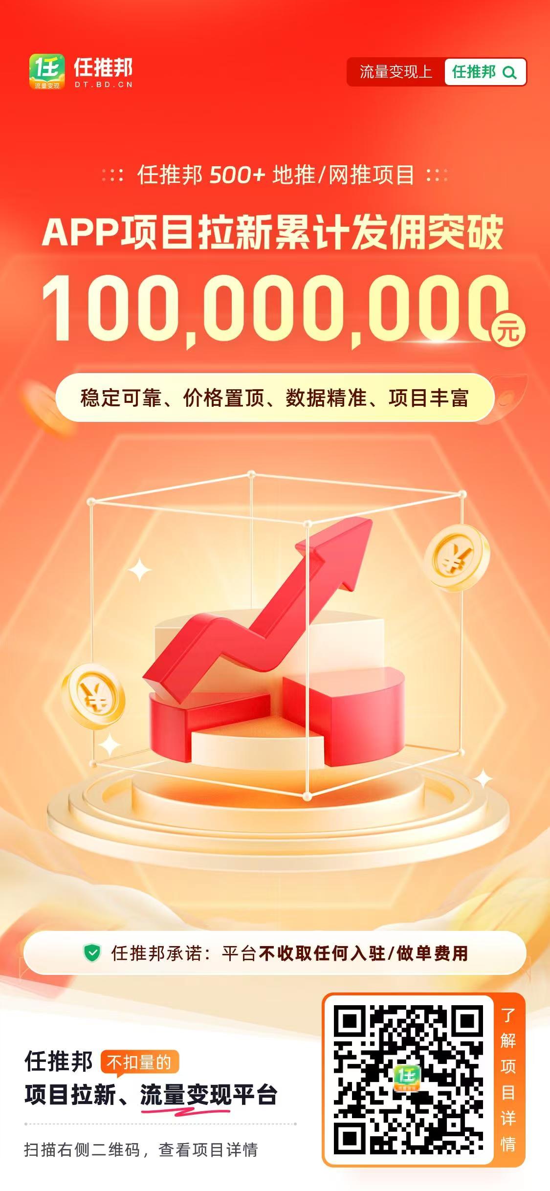 任推邦是批量拉新赚钱的平台,在里面可以接各大APP的拉新任务,比如夸克网盘、迅雷网盘、京东、小红书等等。根据项目的不同,拉一个新人佣金在5-50元不等。